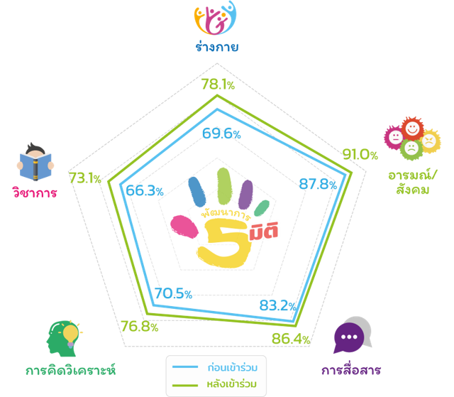คะแนนเฉลี่ยของพัฒนาการ 5 มิติของนักเรียนเปรียบเทียบรอบก่อนและหลังจากการเข้าร่วมกิจกรรม